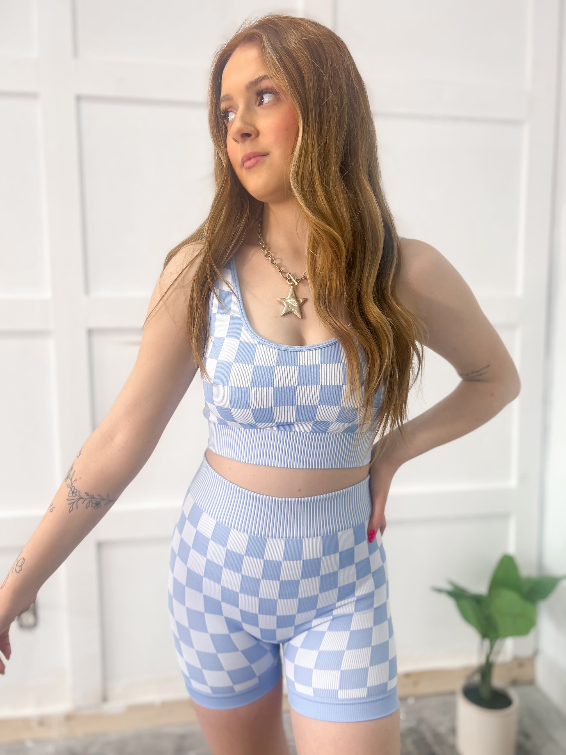 Our best selling checker biker short set in another color way! Runs true to size with a super compressed fit!