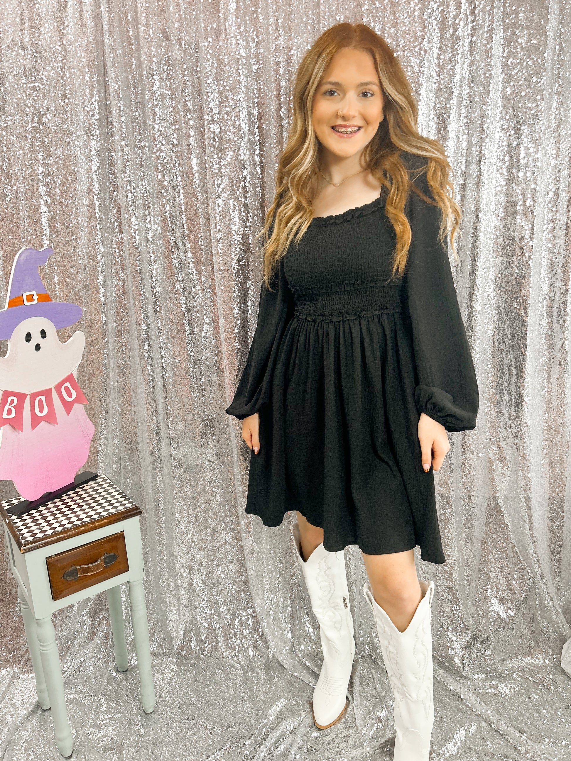 The In the Night Dress is the perfect combination of comfort and style. The flowy black fabric is complemented by smocking detail in the front and a bow tie detail in the back, creating a flattering fit. Whether you're running errands or going out for a night on the town, this dress will make you feel confident and comfortable.