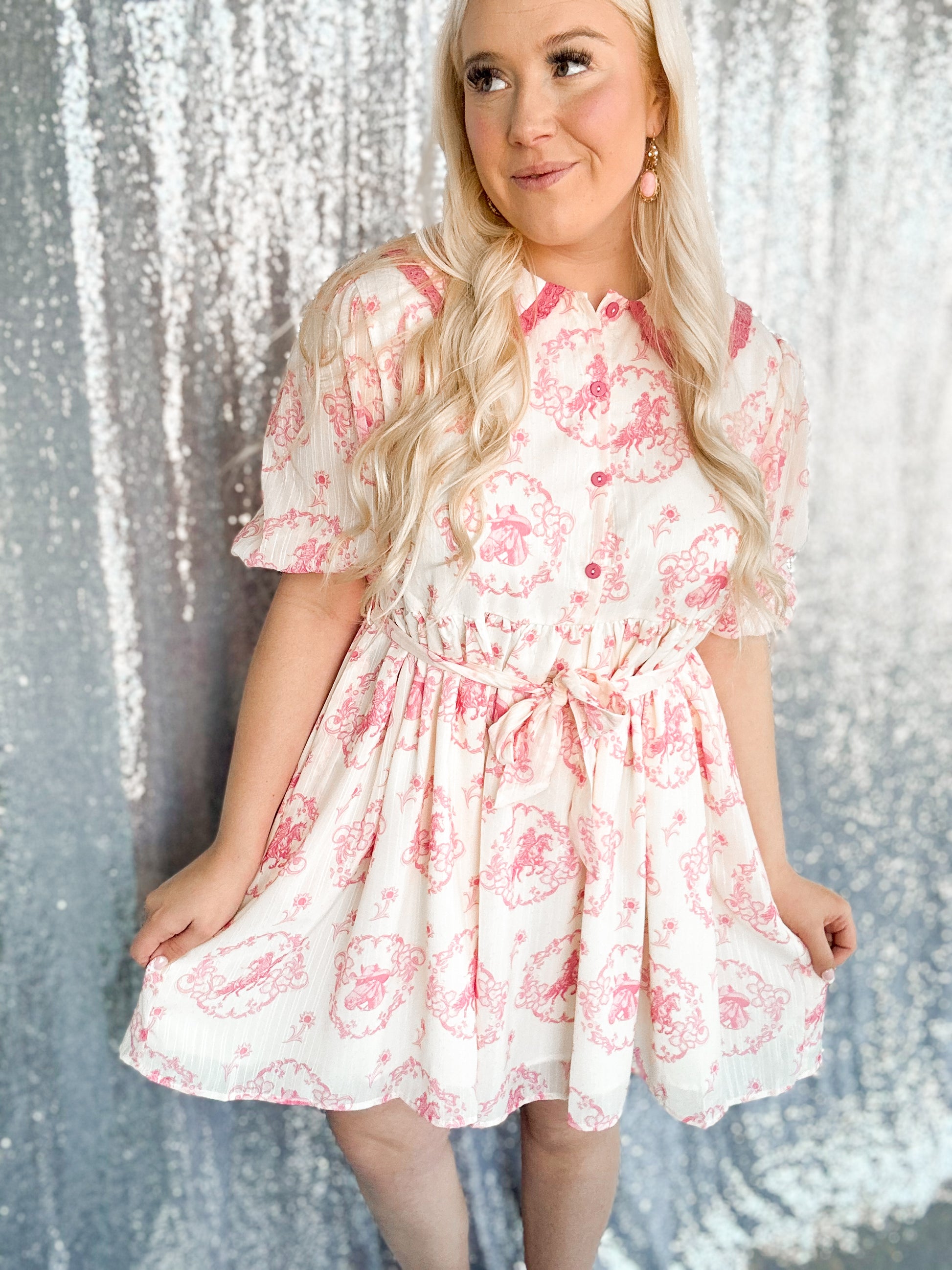 This beautiful carriage print dress is a must have for spring and summer! Offers a gorgeous collar with lace trim, functional buttons, and a waist tie that can be removed!