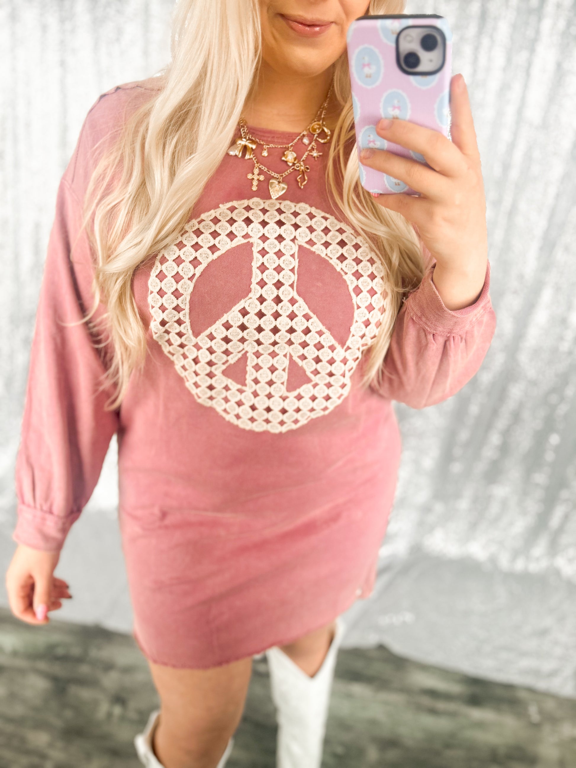 Embrace your unique style with the Pink Peace Patchwork Dress! This charming piece, with its delightful oversized fit and intricate lace detailing along the back, offers both comfort and elegance. Experience the joy of effortless dressing that celebrates individuality and femininity. Shine with confidence!